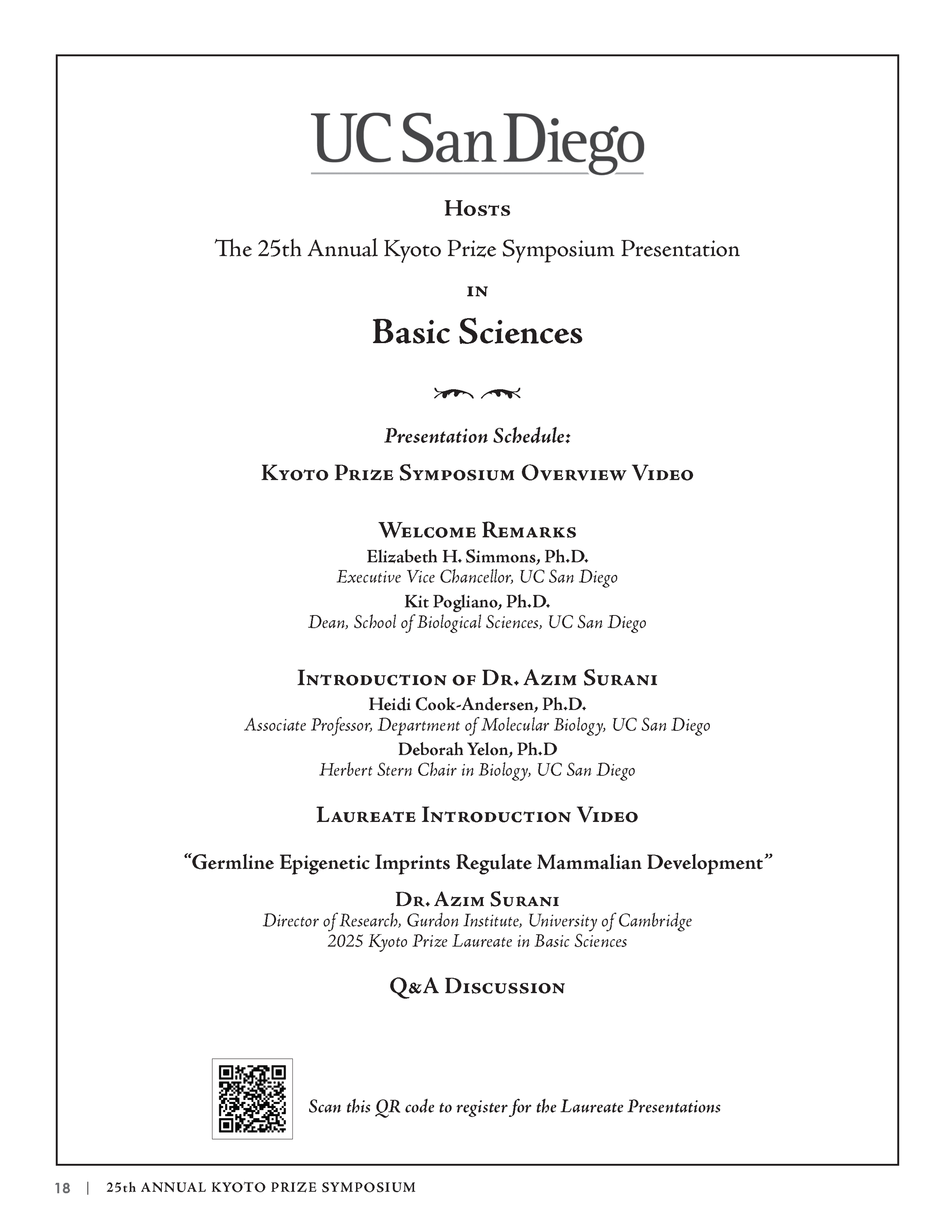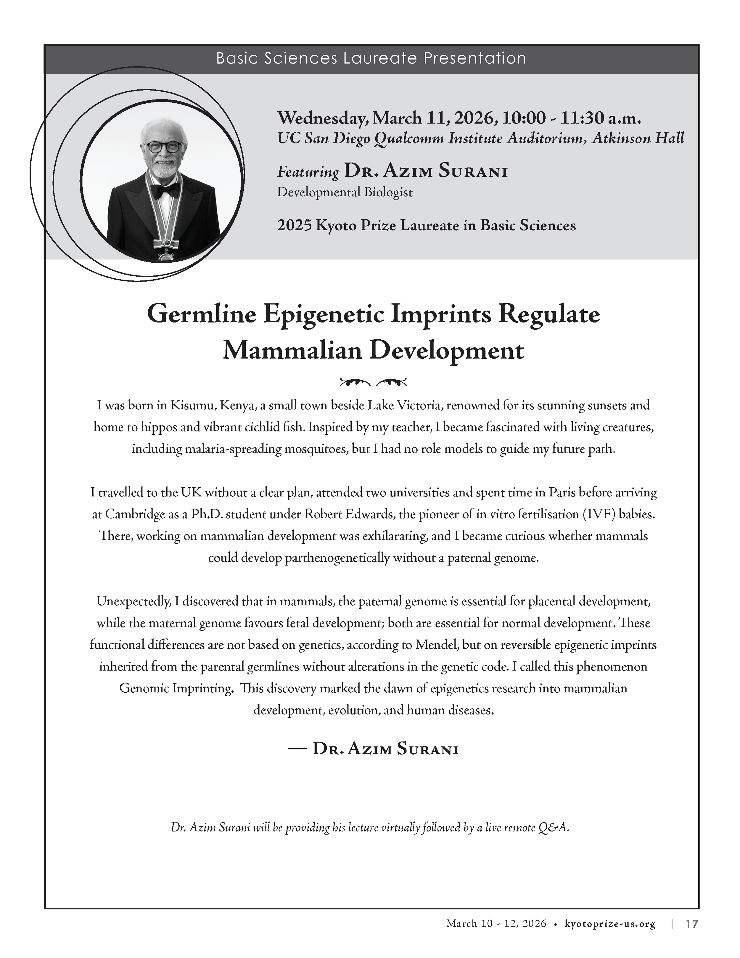 Azim Surani is the 2025 Kyoto Prize Laureate in Basic Sciences. He demonstrated that both paternal and maternal genomes are indispensable for normal mammalian development and subsequently discovered genomic imprinting that confers specific modifications and complementary functions to each genome. Furthermore, he has played a pioneering role in elucidating its underlying mechanisms, thereby making contributions to foundational scientific insights across a broad spectrum of life science fields.