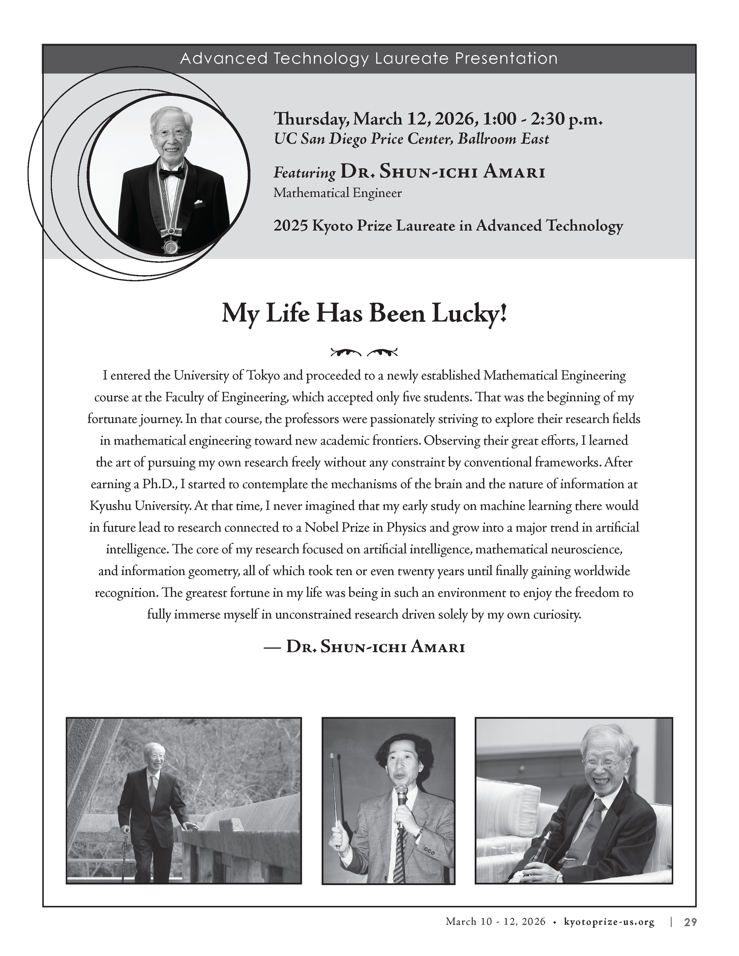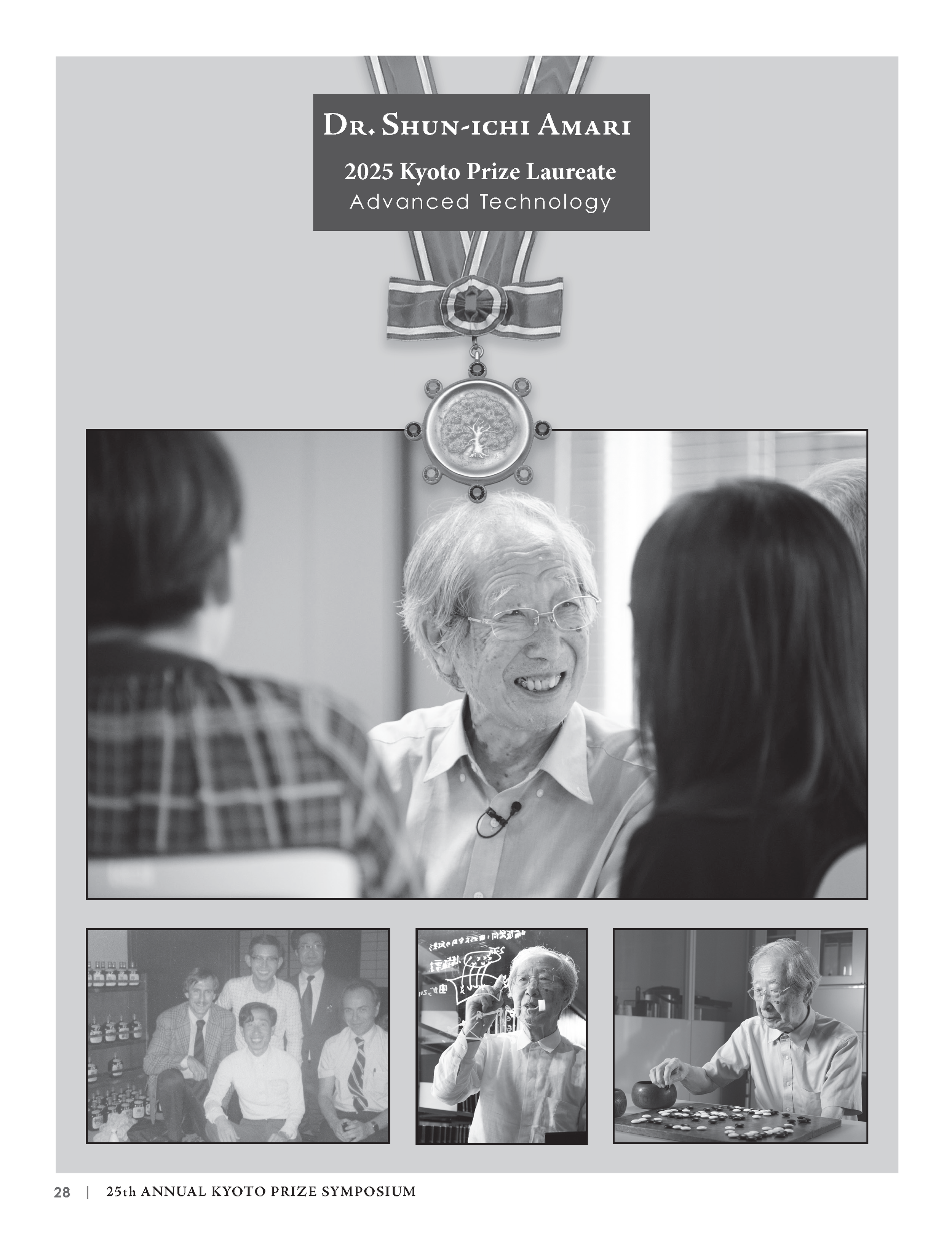 Shun-ichi Amari is the 2025 Kyoto Prize Laureate in Advanced Technology. He has conducted pioneering research in artificial neural networks and established the field of information geometry, which studies statistical models using the techniques of differential geometry, thereby proposing many important theories. His contributions to both theory and application, influencing various fields, are of major significance.